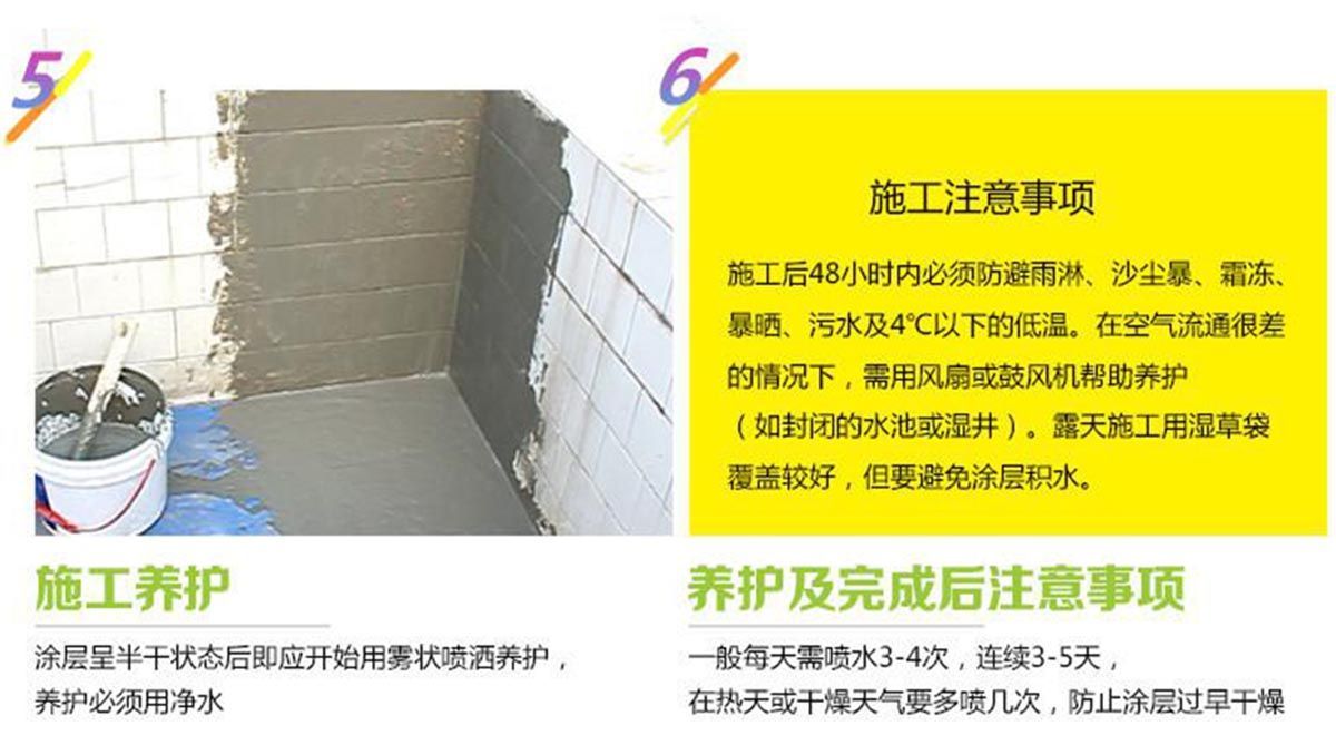 底層必須完全固化、完好、沒有灰塵,清除浮漿、油、油脂、脫膜劑及其它會影響防水效果